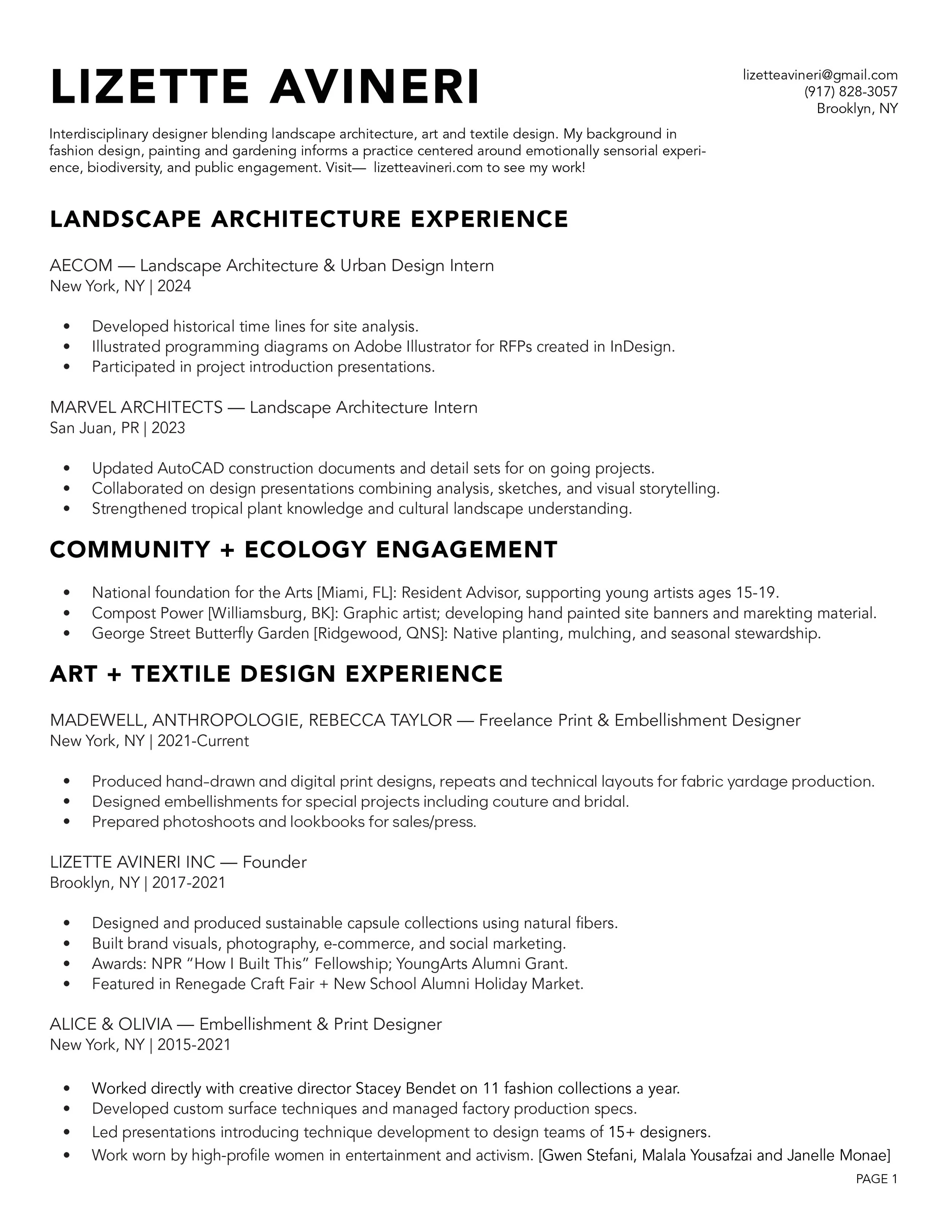 As a 2025 graduate of the Masters of Landscape Architecture program at the City College of New York, she looks forward to adding her creative magic in future developments of urban green spaces focusing on the celebration of all artistic forms with an emphasis on the importance of bio-diversity and climate resilience.
